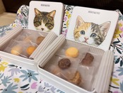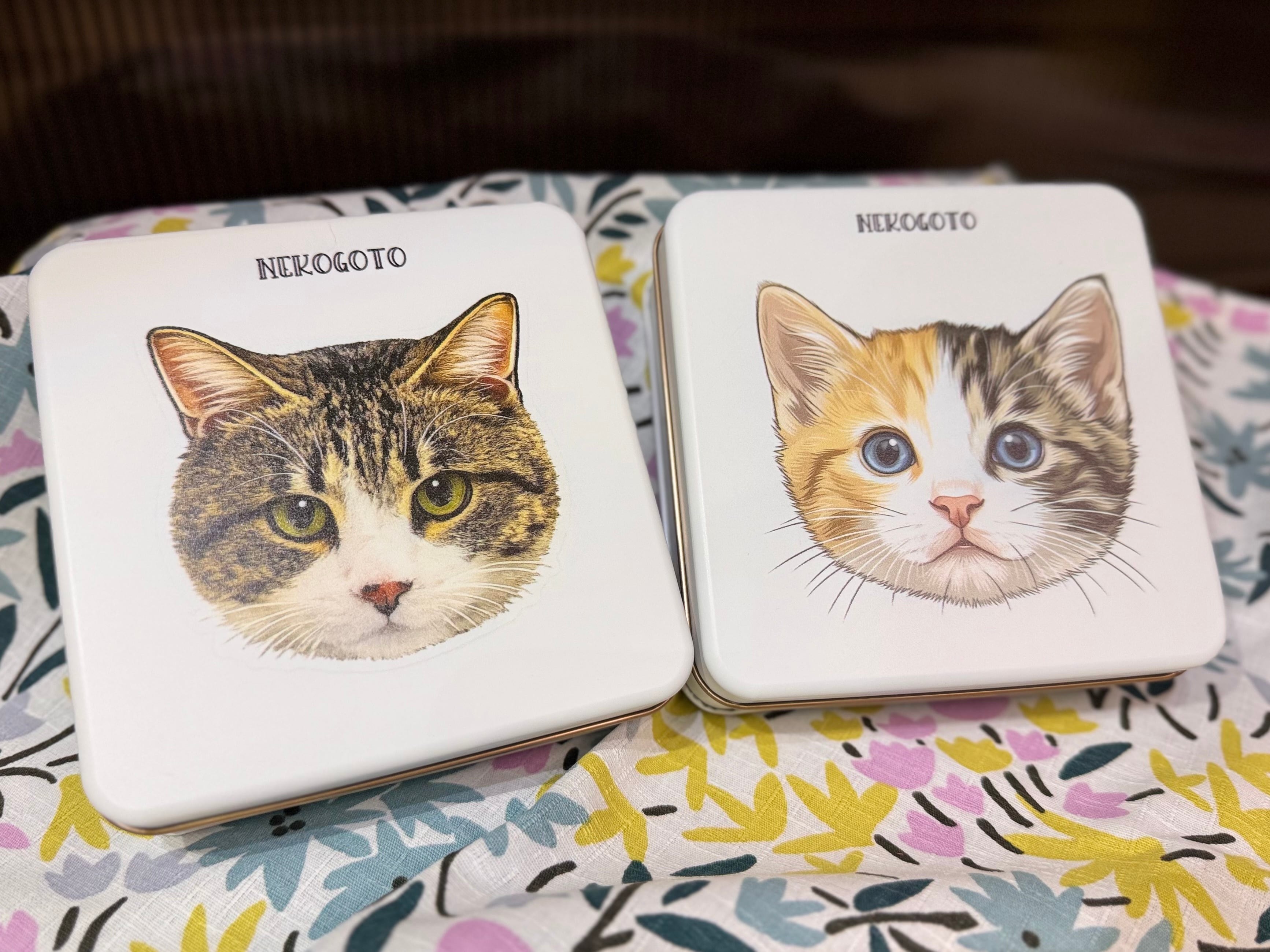 NEKOGOTO出身の保護猫たちのギフトクッキー缶です。左側がゼロ、右側が天音それぞれ個別に販売しております。